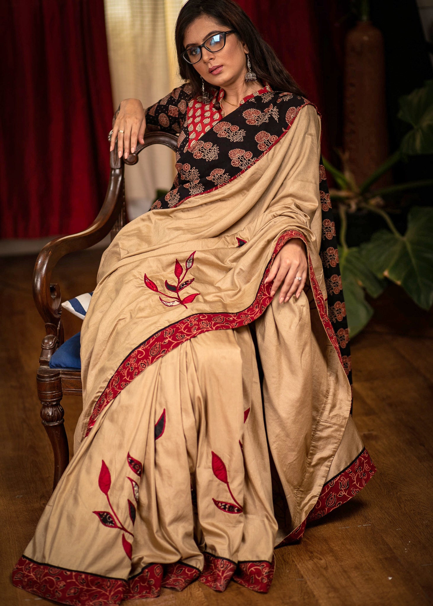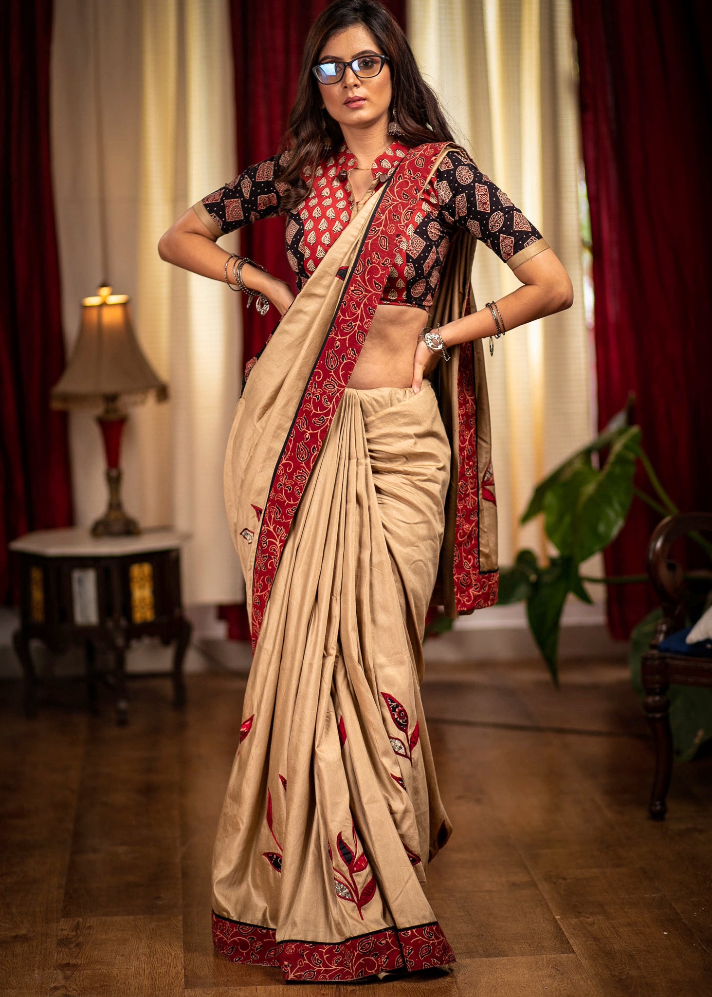 Beige semi silk saree with exclusive hand applique work