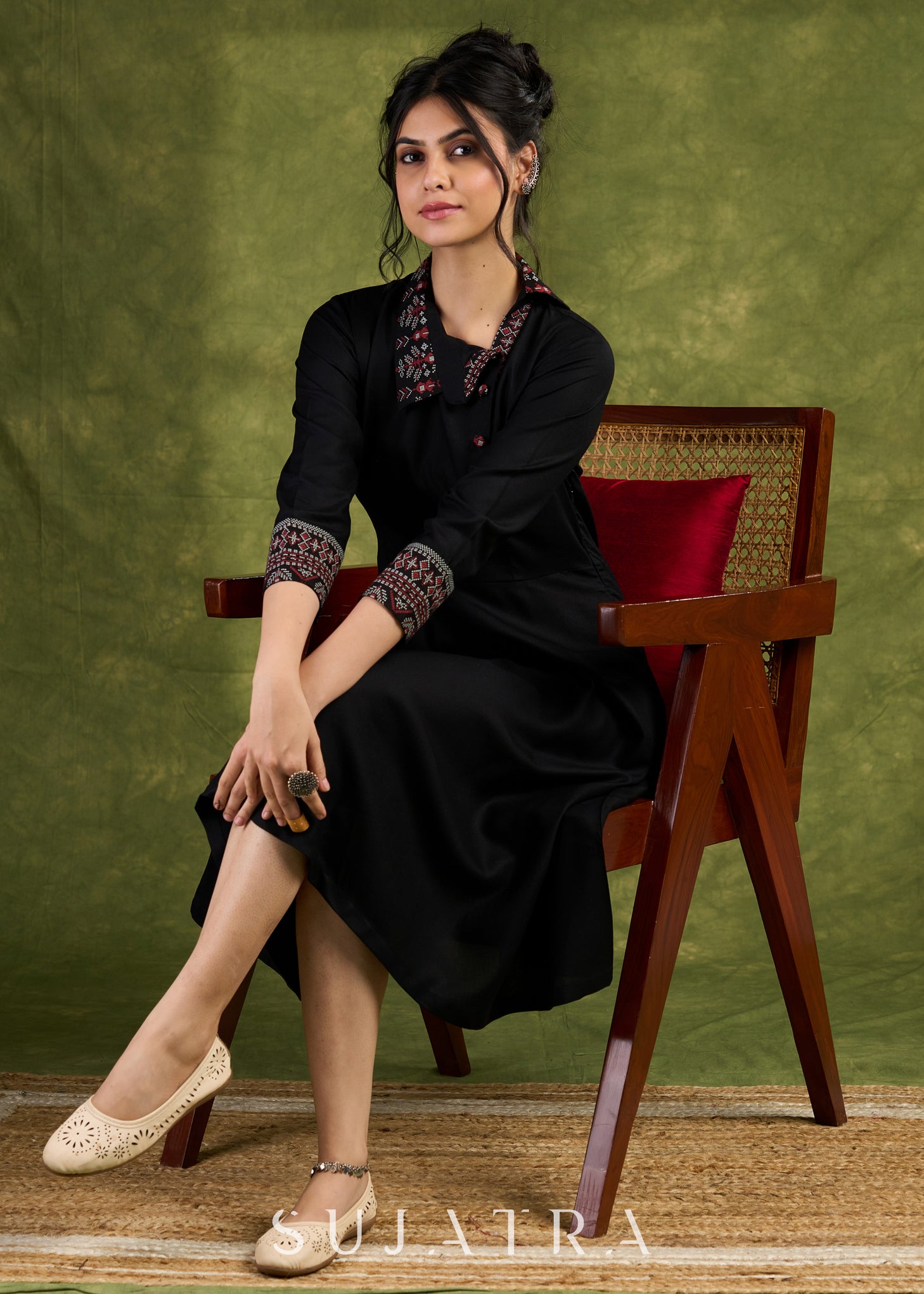 Sophisticated Black Rayon Dress With Printed Collar And Cuffs