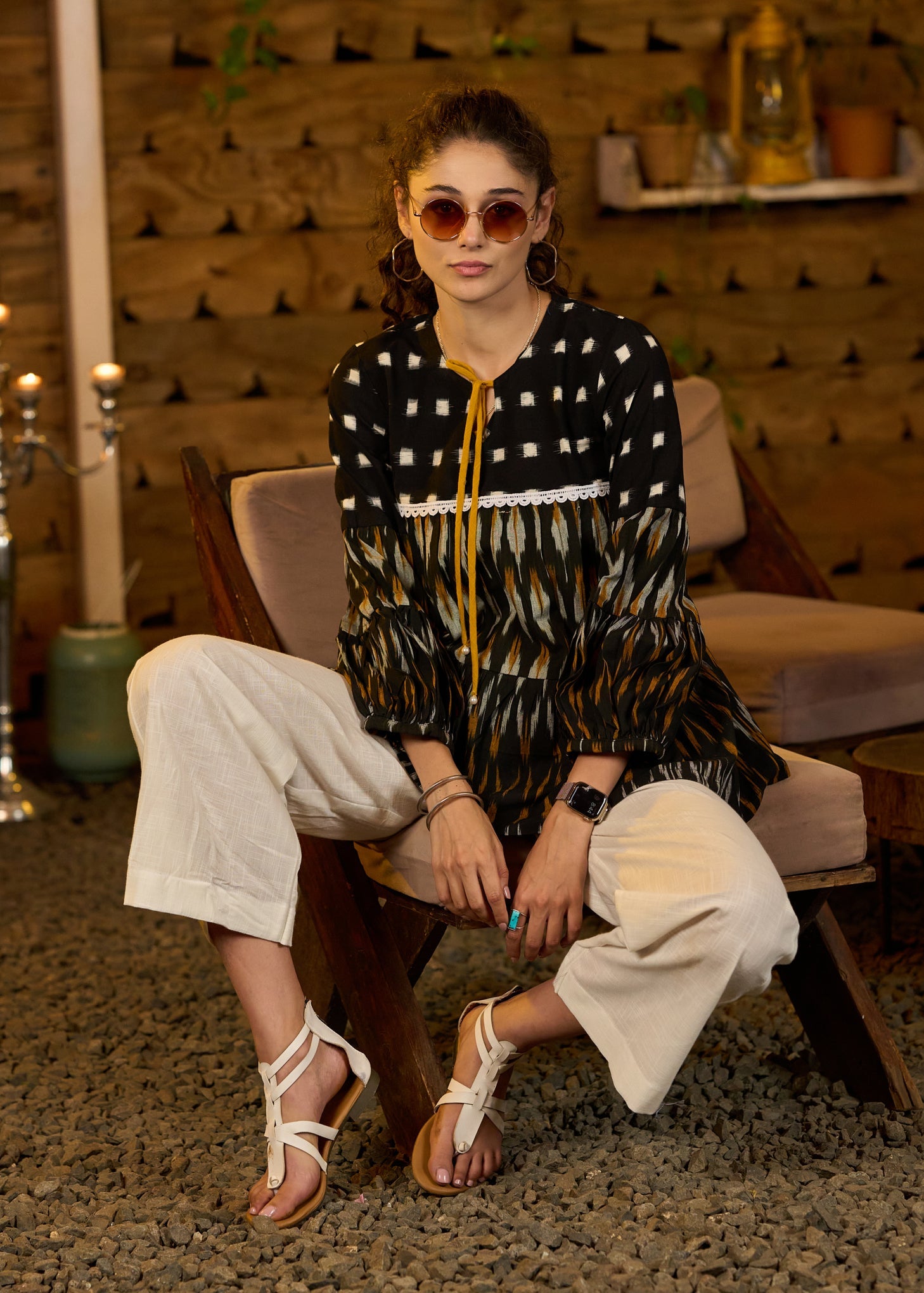 Black & Mustard ikat tiered top with front tie-ups - Pant optional