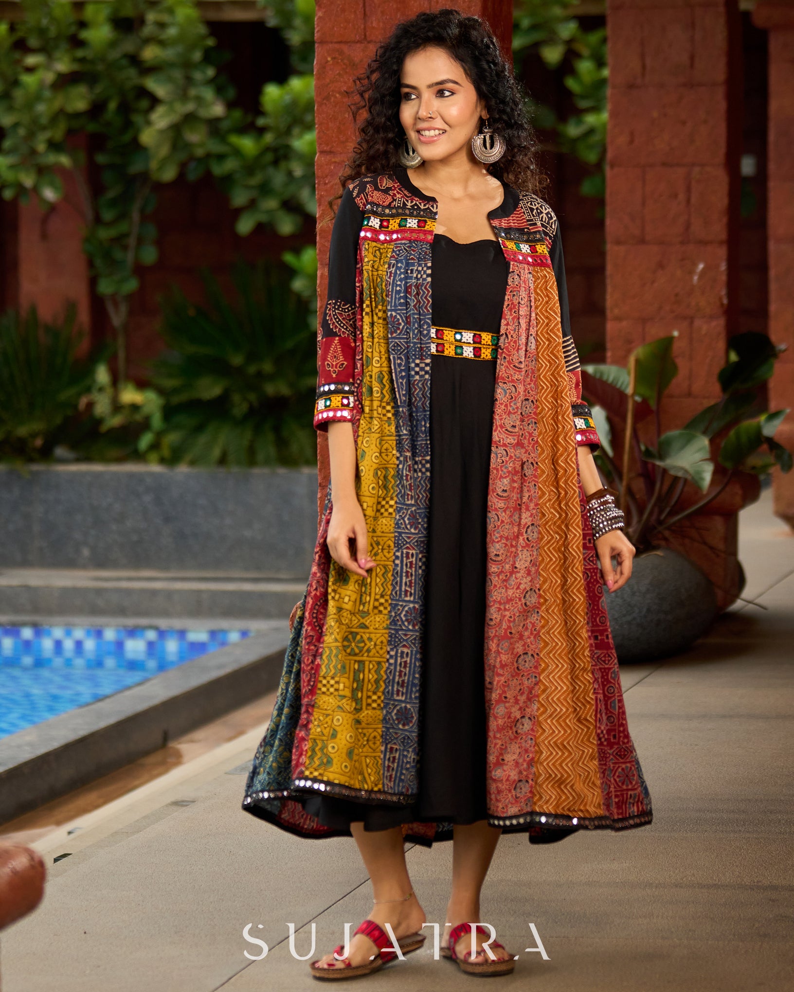 Black Rayon Double-Flared Sleeveless Dress with Mirror Work Embellishments - Patchwork Ajrakh Jacket Additional
