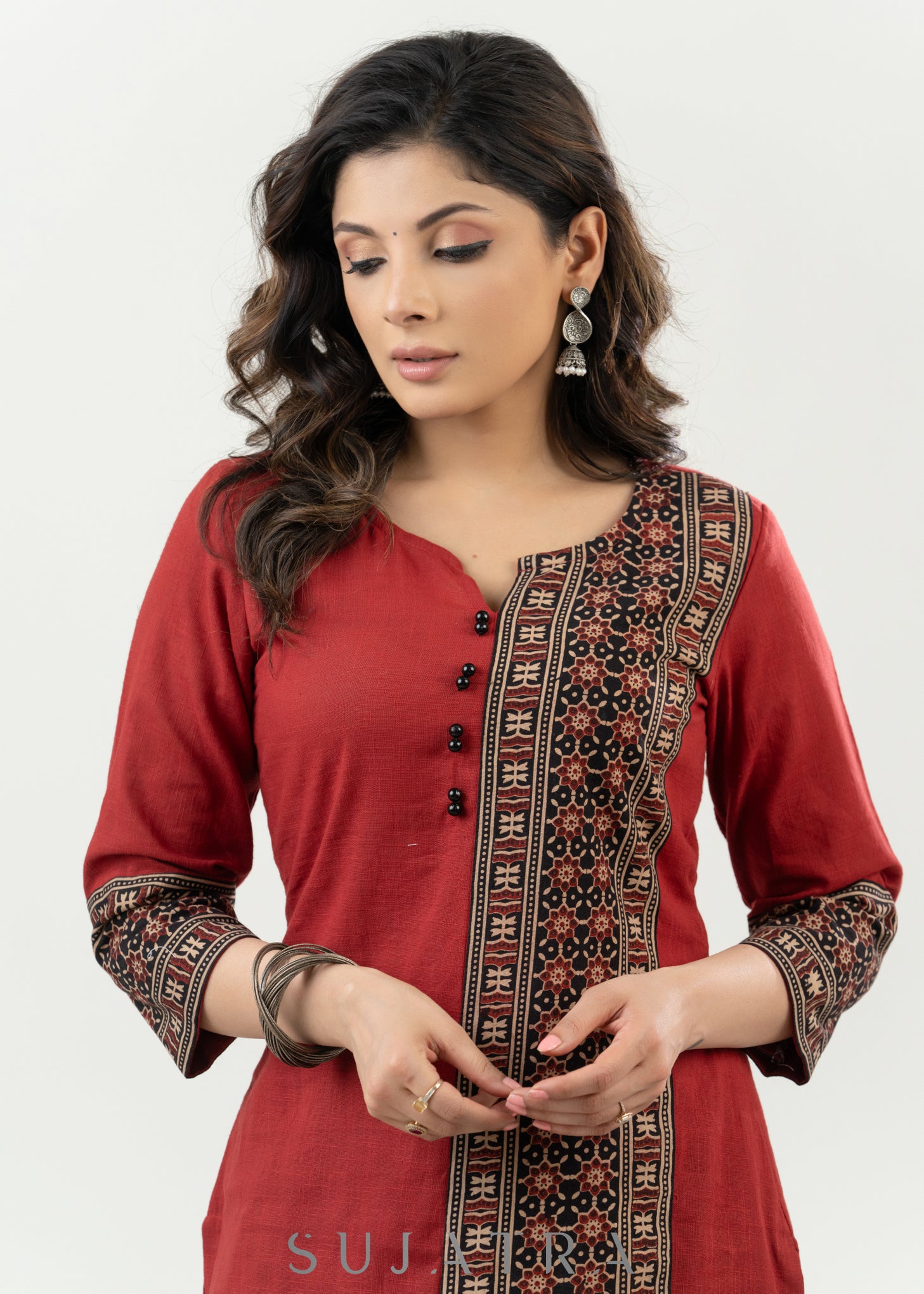 Casual Maroon Cotton Ajrak Combination Kurta - Pant Optional
