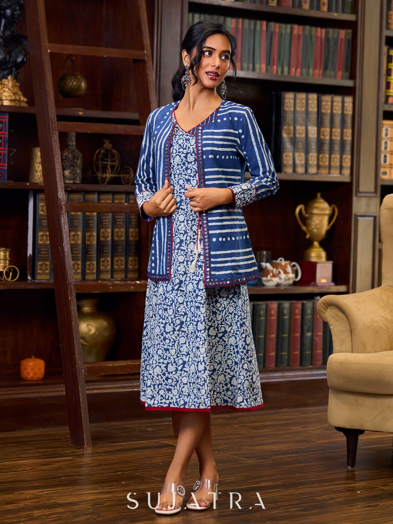 Graceful Indigo Cotton Jacket with Geometric Prints with Maroon Piping and Contrast Floral Cuffs