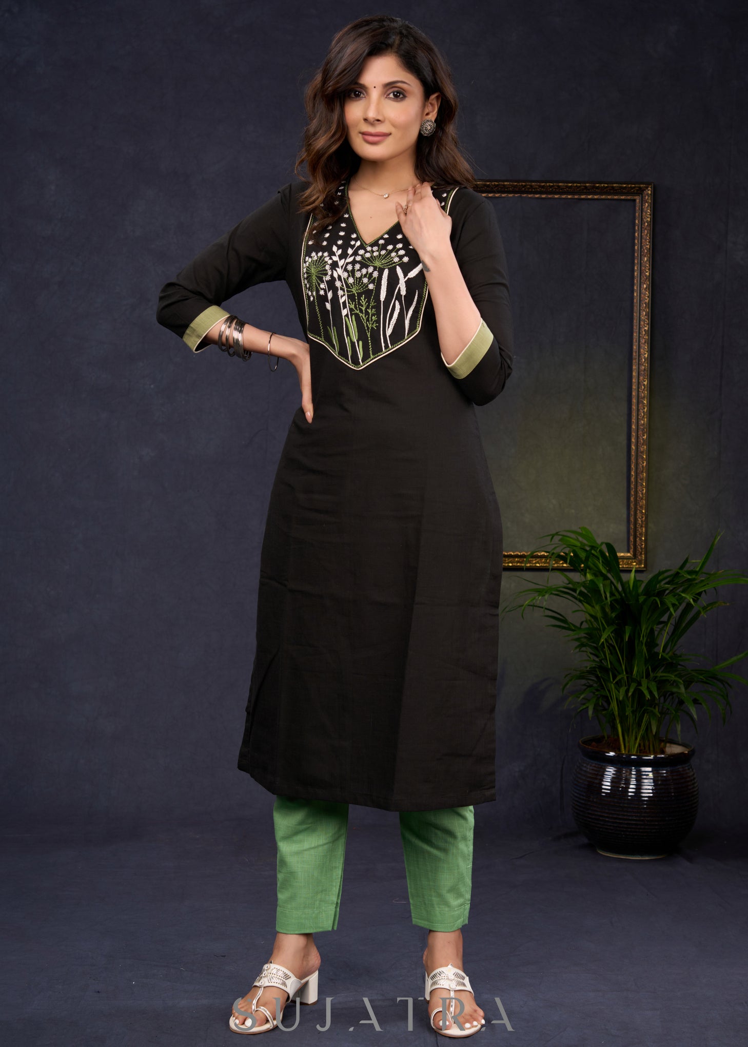 Classic-Black-Cotton-Straight-Cut-Kurta-With-Beautiful-Floral-Embroidered-Yoke--Pant-Optional