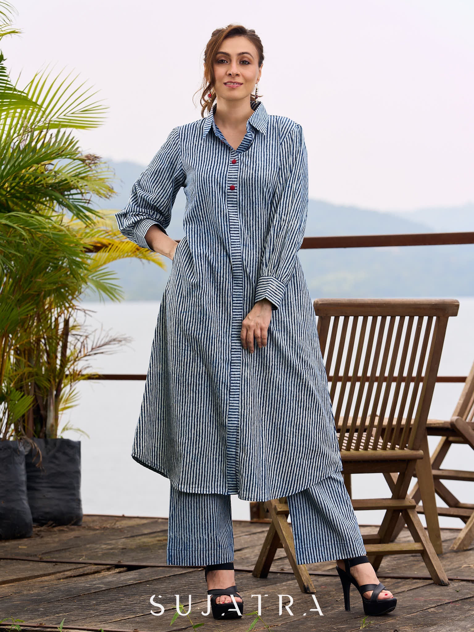 Classic Indigo A-Line Kurta with Vertical Stripes and Front Button Detailing