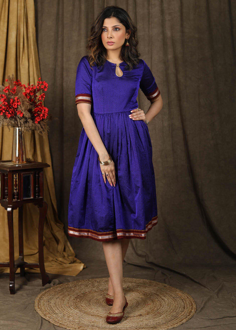 Classy violet gathered A-line khun dress with keyhole neck.