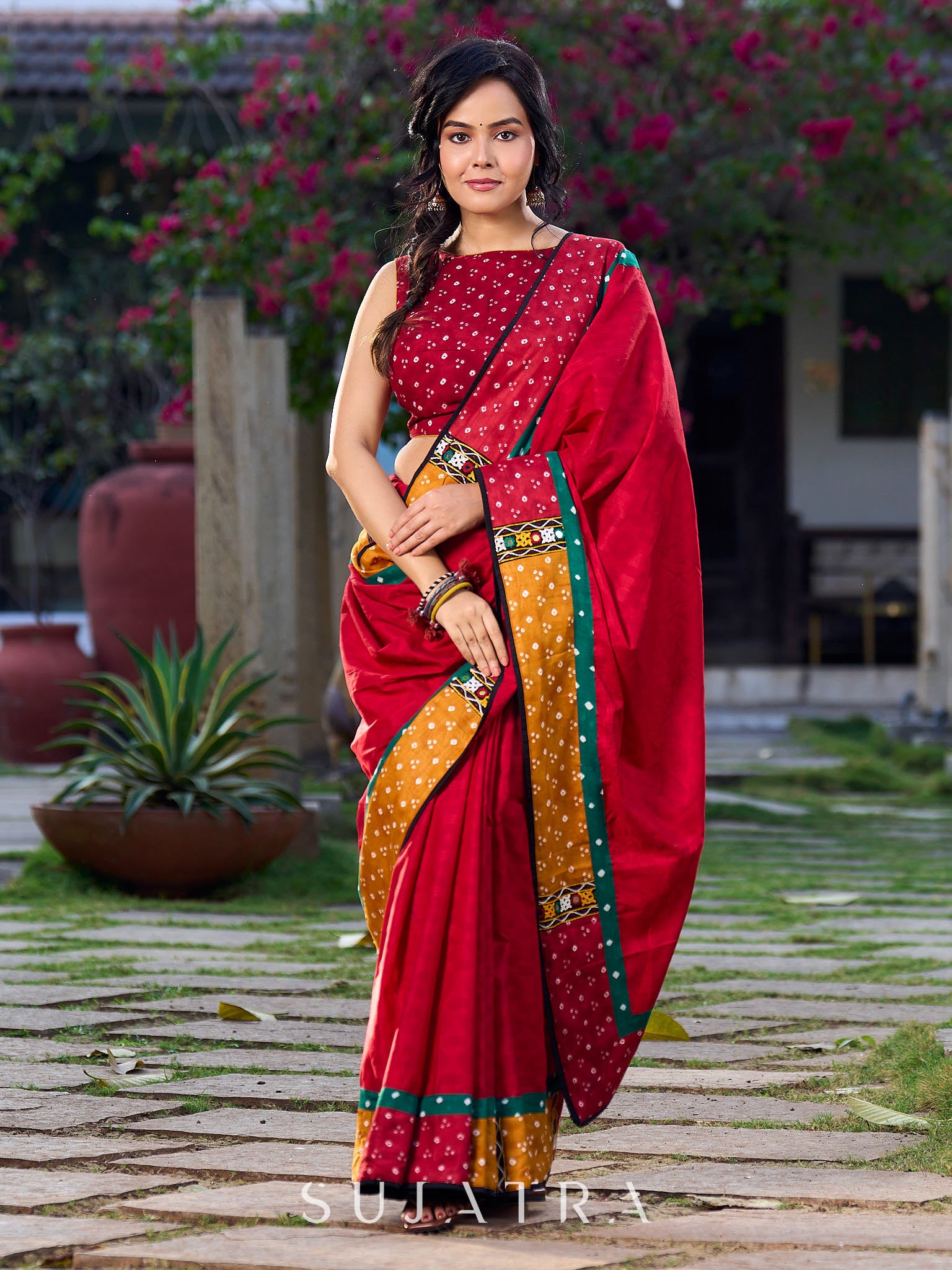 Crimson Cotton Jacquard Saree with Mustard & Red Bandhani Accents