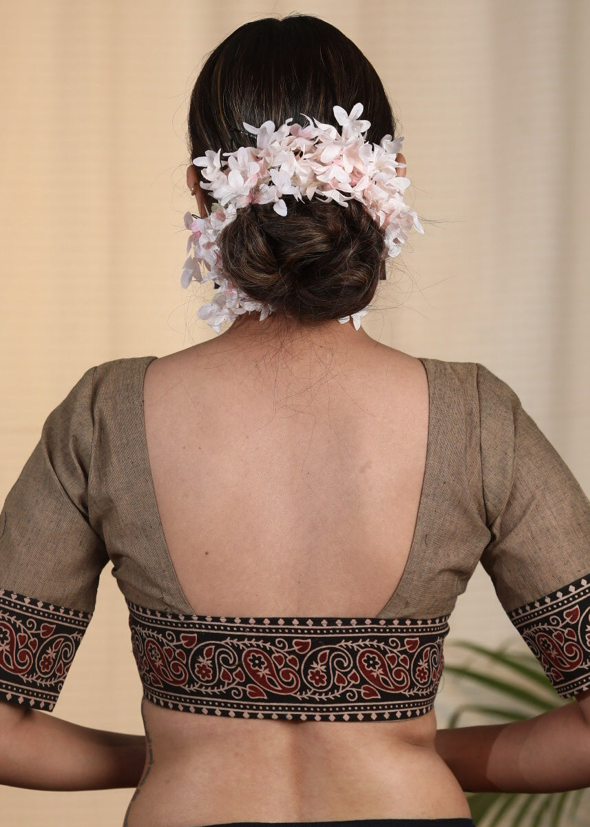 Elegant and Striking Chikoo colored Cotton Handloom Blouse with Ajrakh Border