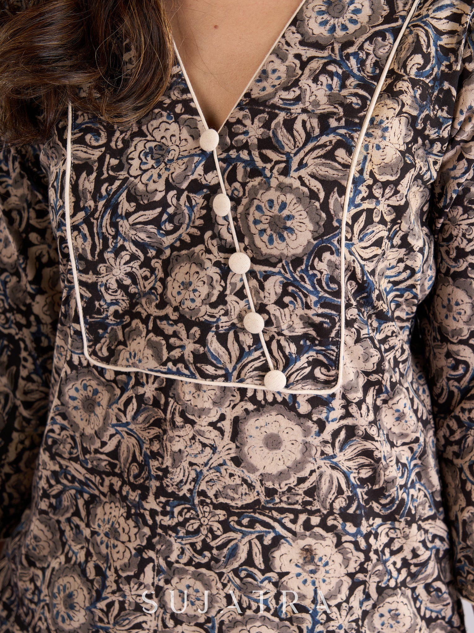 Elegant Black Kalamkari Cotton Kurta with Off-White Piping Accents