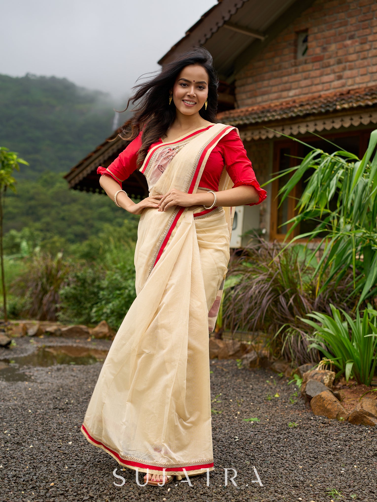 Elegant cream chanderi saree with subtle red border, featuring hand-painted Durga art
