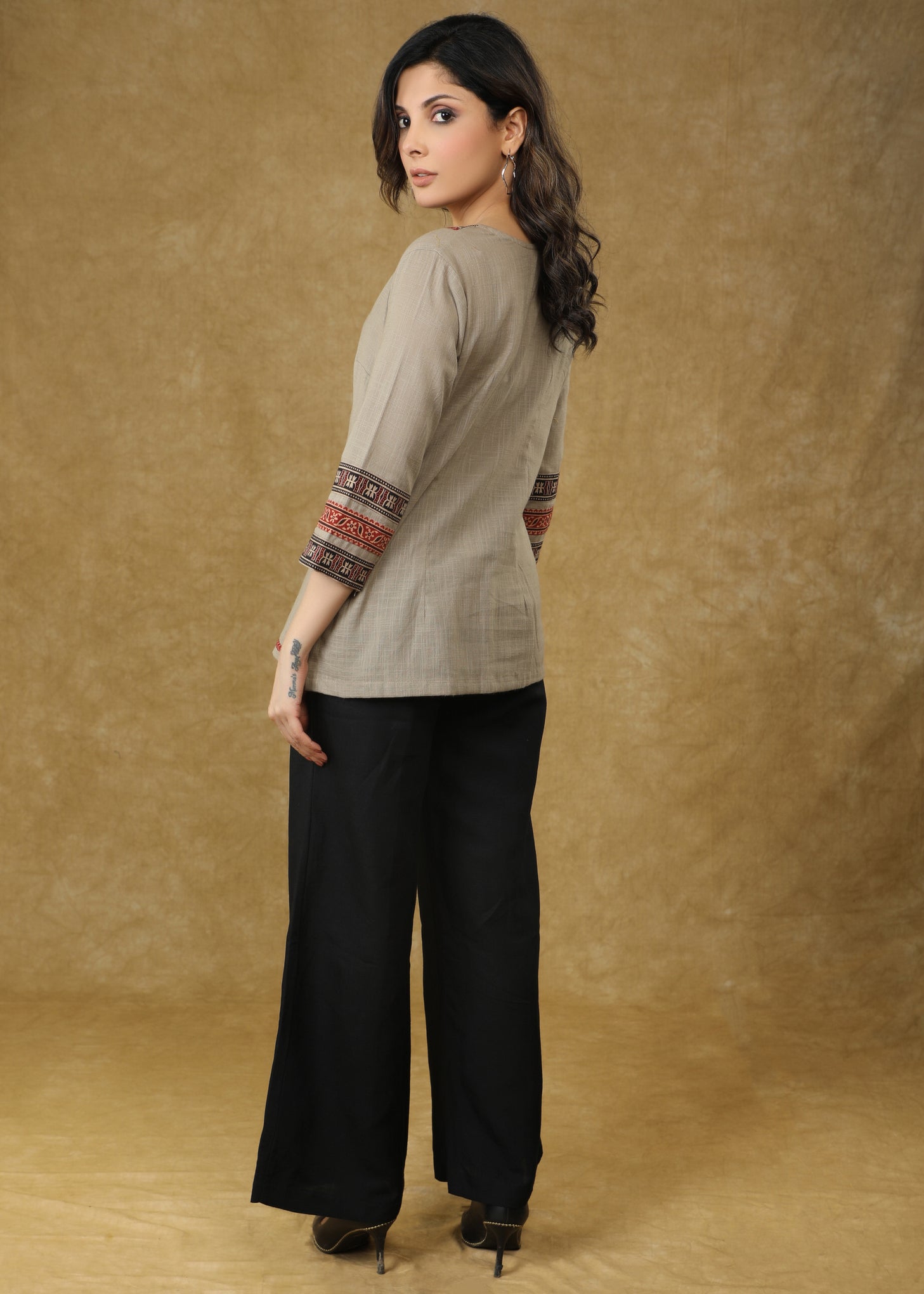 Elegant Grey Cotton Top with Ajrakh Combination on Sleeves & Neck
