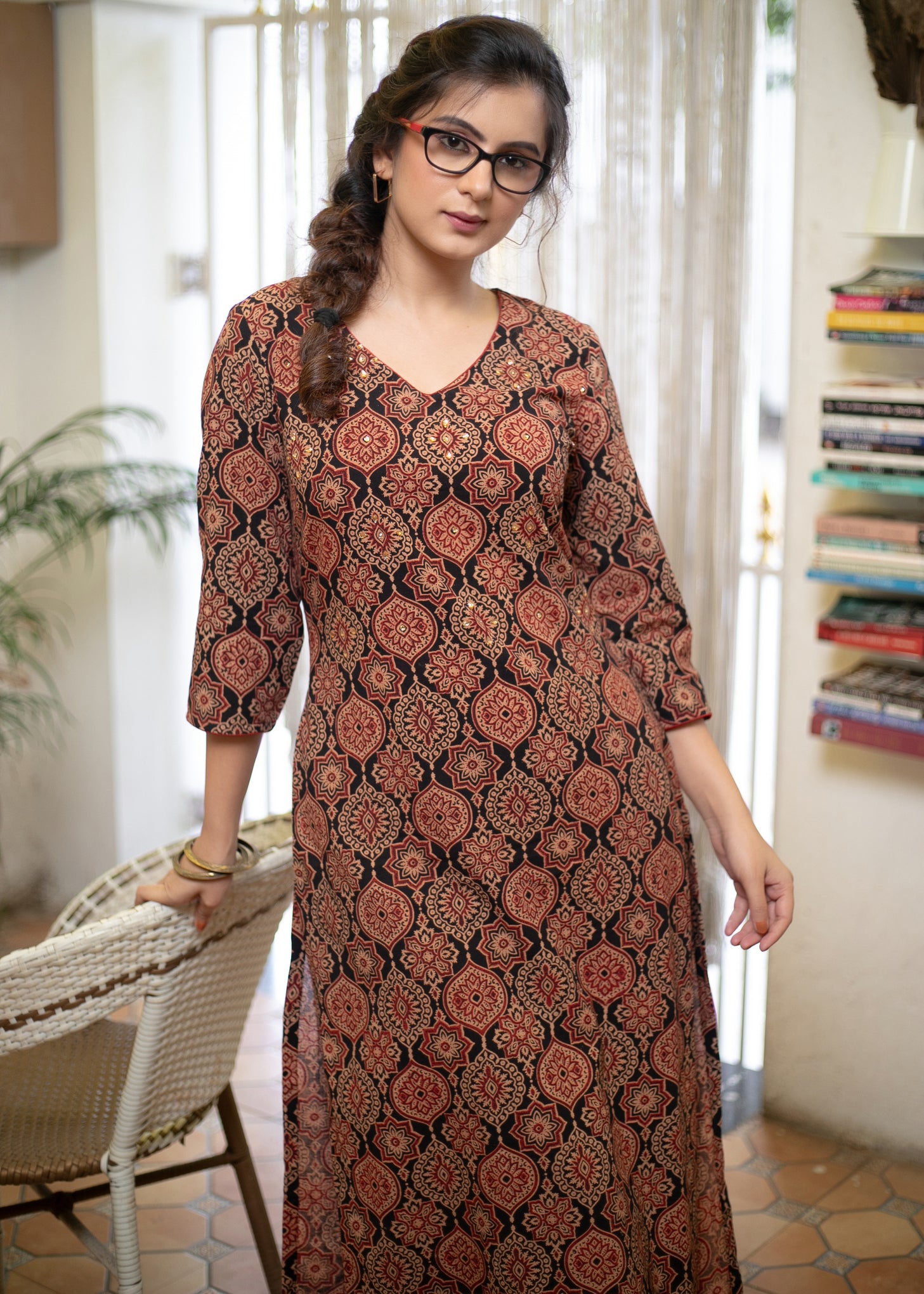 Elegant Mughal Print Straight Cut Cotton Ajrakh Kurta with Stone Embellishment on Yoke - Pant Optional