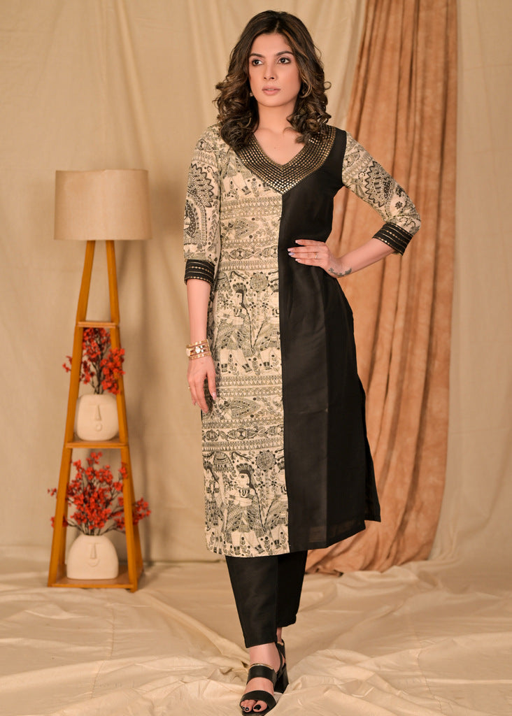 Exclusive Black Cotton Silk and Madhubani Print Combination Kurta with Hand Embroidery on Neckline and Sleeves - Pant Optional