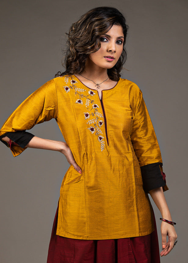 Exclusive mustard cotton top with hand embroidered zardosi embroidery