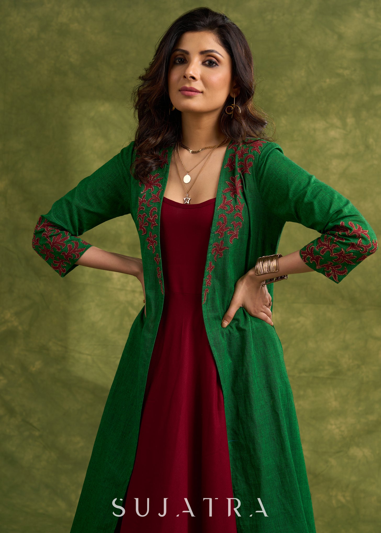 Hand Crafted Emerald Green Cotton Shrug With Vibrant Maroon Applique Accents Dress Optional