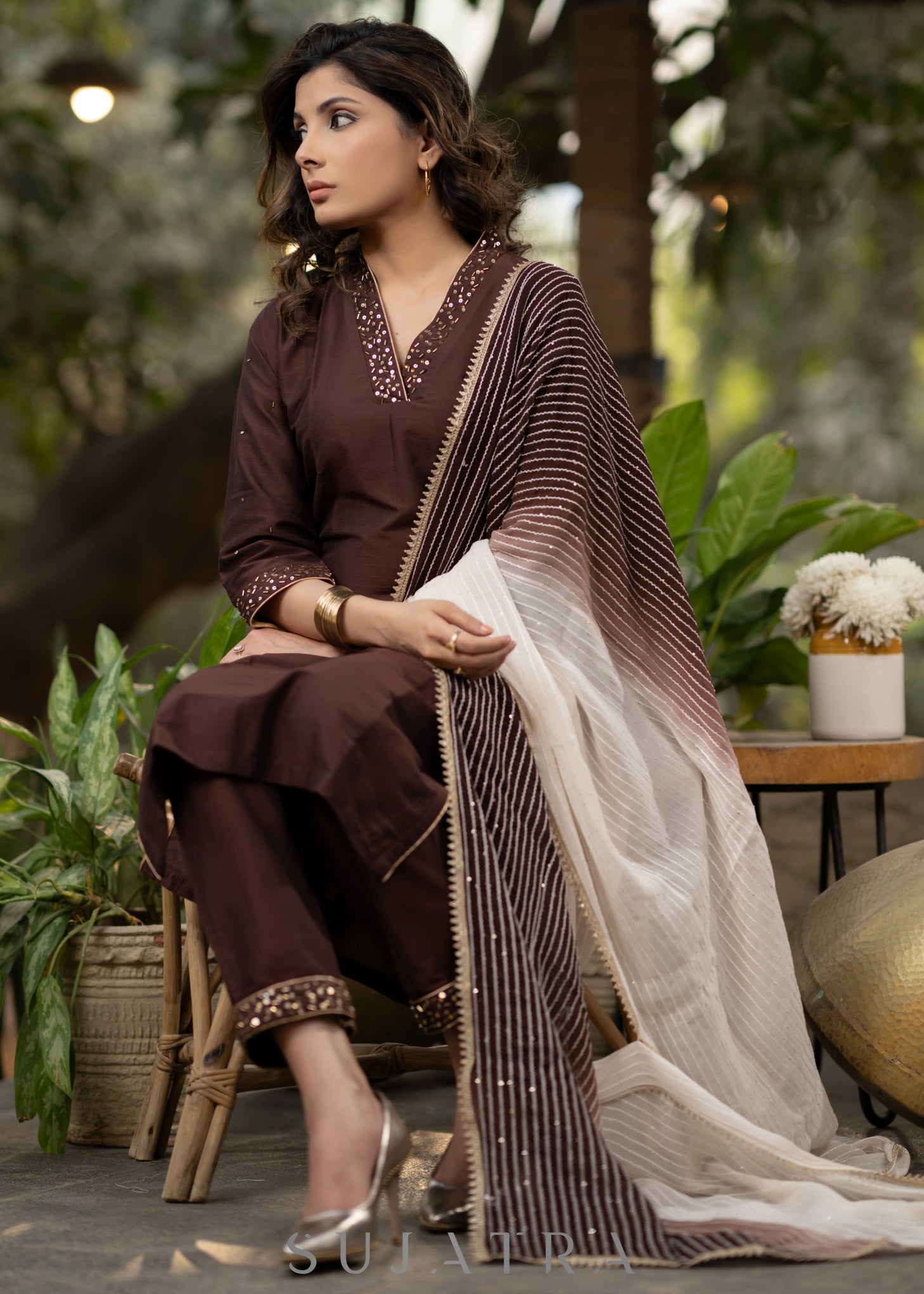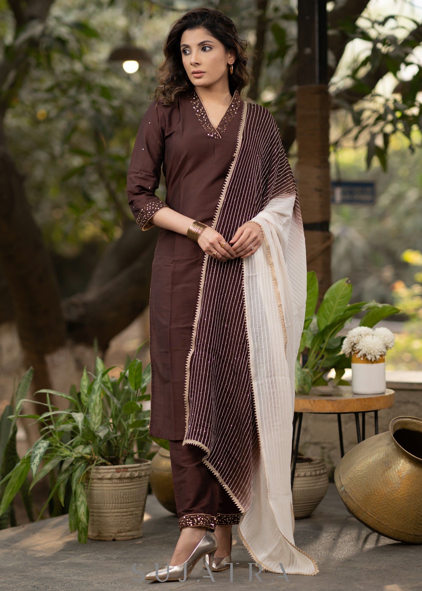 Hand embroidered beautiful coffee brown kurta