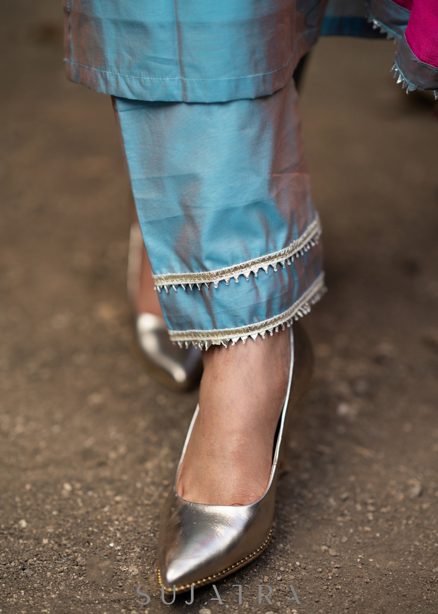 Hand embroidered dual shaded firozi chanderi kurta