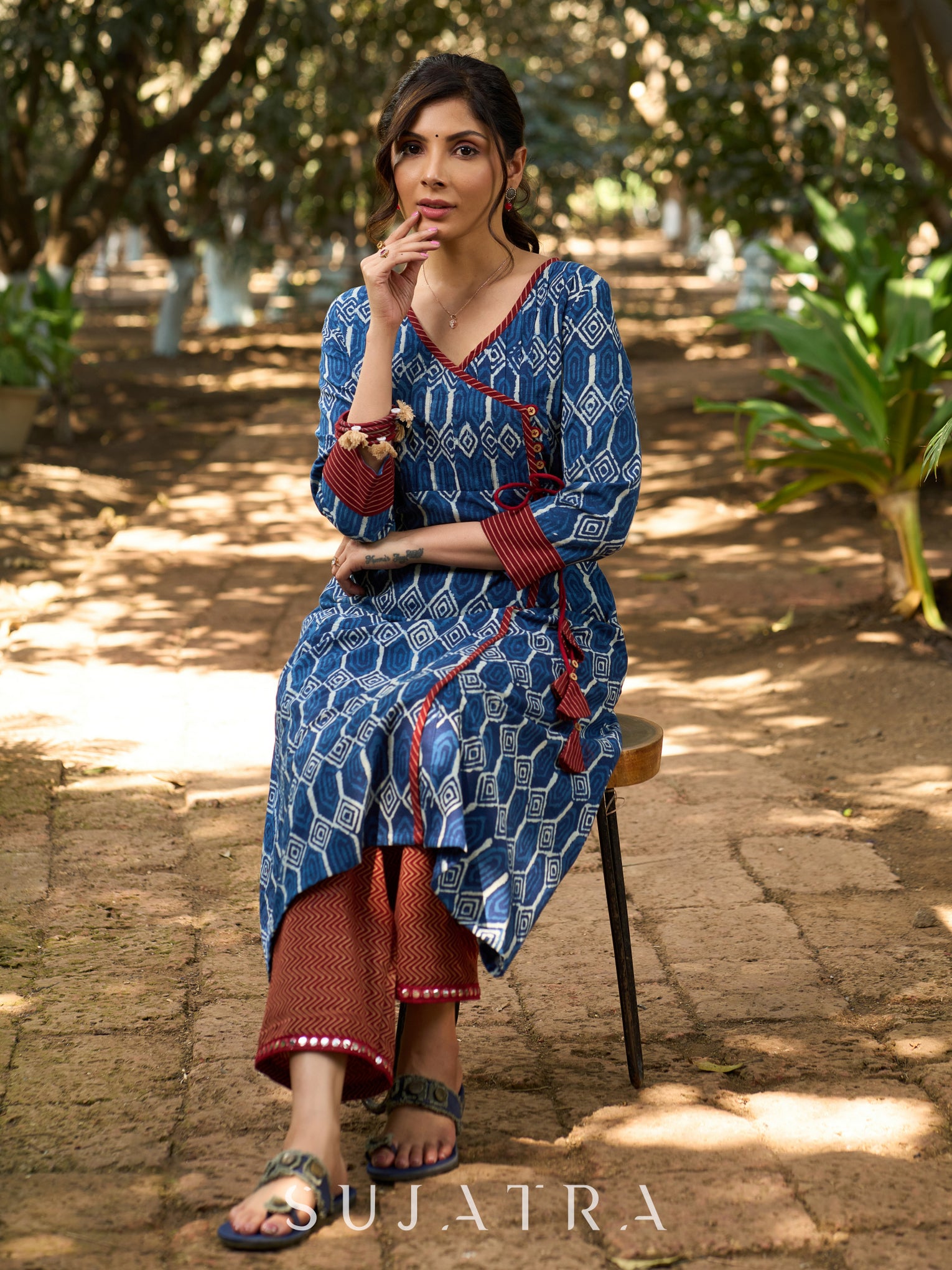 Indigo Bliss Handblock Angarkha Style Kurta with Geometric Print, Contrast Ajrakh Border & Tassel Tie-Up Detailing