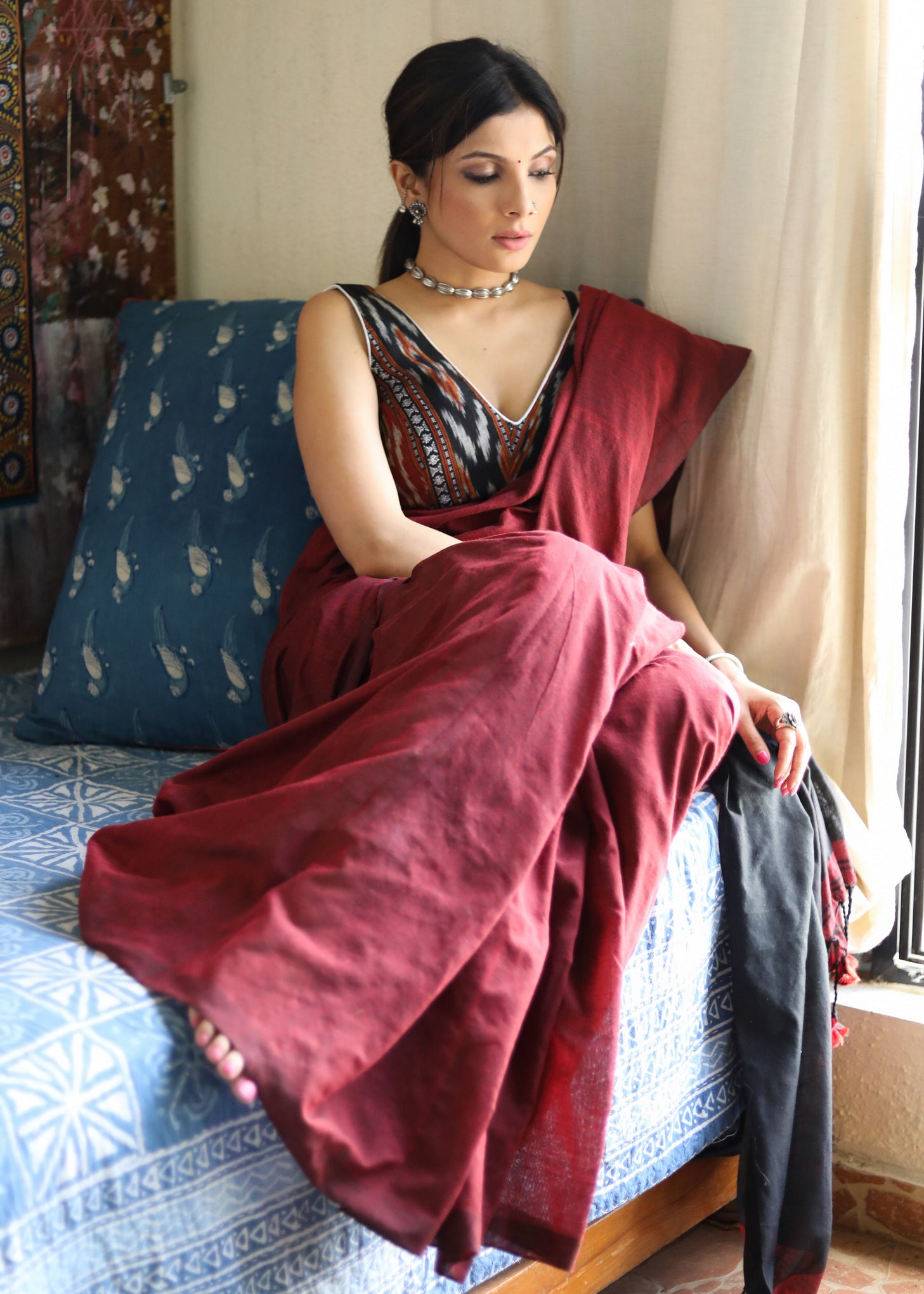 Lightweight maroon & black combination Cotton saree with Ikat blouse