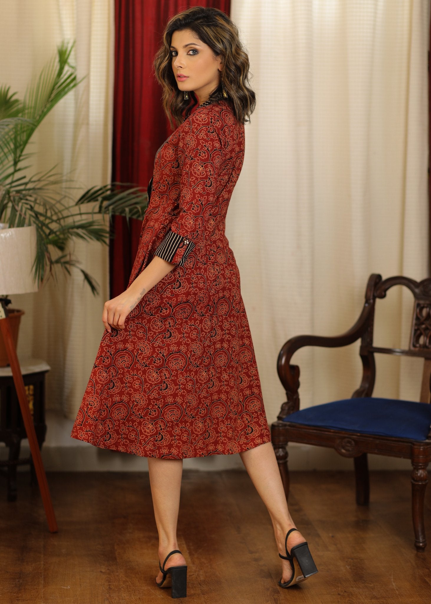 Maroon ajrakh with stripes combination collared dress with coin embellishment