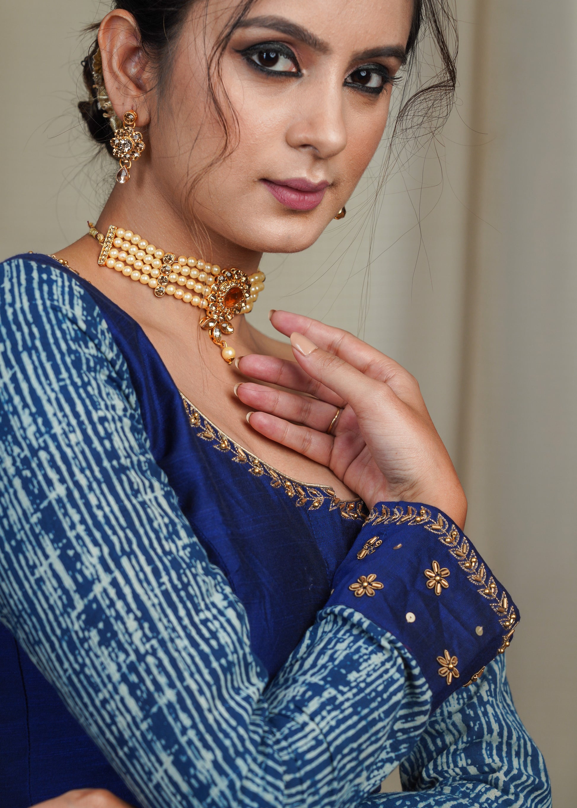 Blue Cotton Silk Blouse with Indigo Sleeves and Hand Embroidery Work On Neck and Cuffs