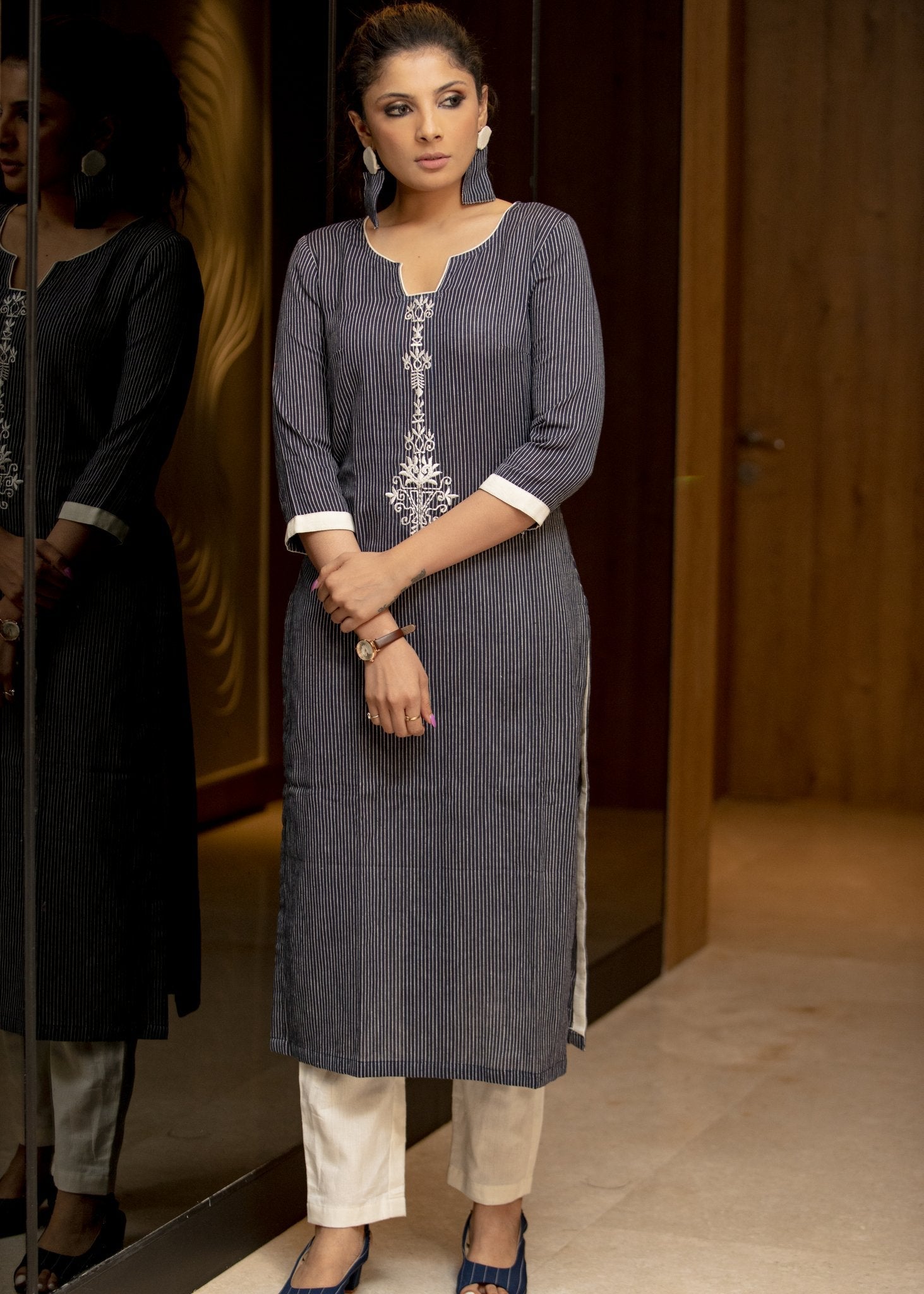 Navy blue pin striped straight cotton kurta with embroidery in front