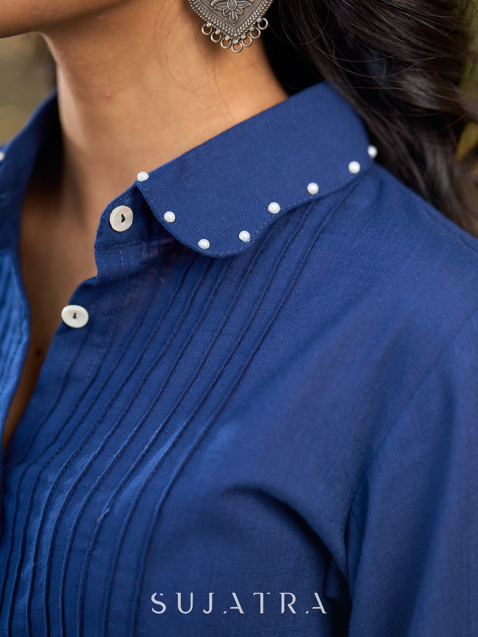 Navy Cotton Shirt Featuring Fine Pintuck Detailing & Statement Sleeves and Collar
