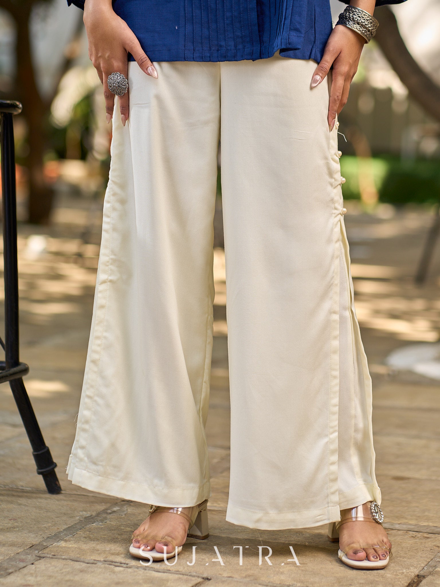 Graceful Off White Rayon Flared Pant With Delicate Pearl Detailing