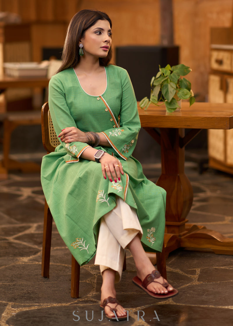 Pretty Pista green cotton asymmetrical kurta with embroidery Pant optional