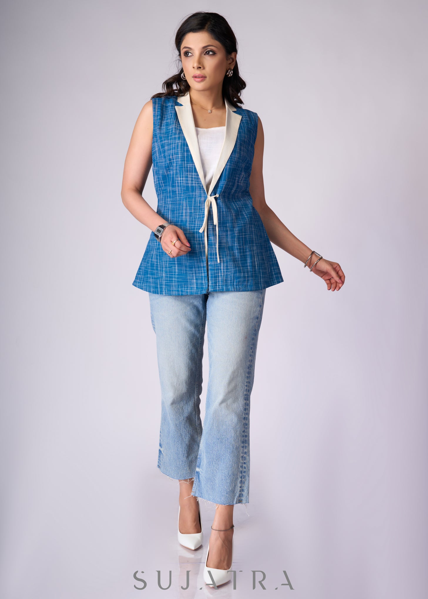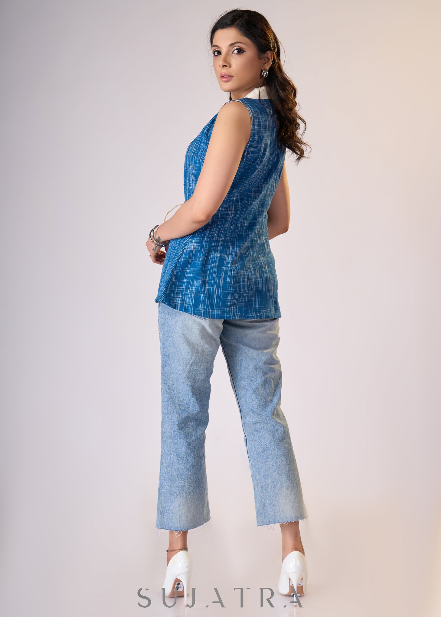 Smart Blue cotton checks sleeveless collared top with front tie-ups & Inner