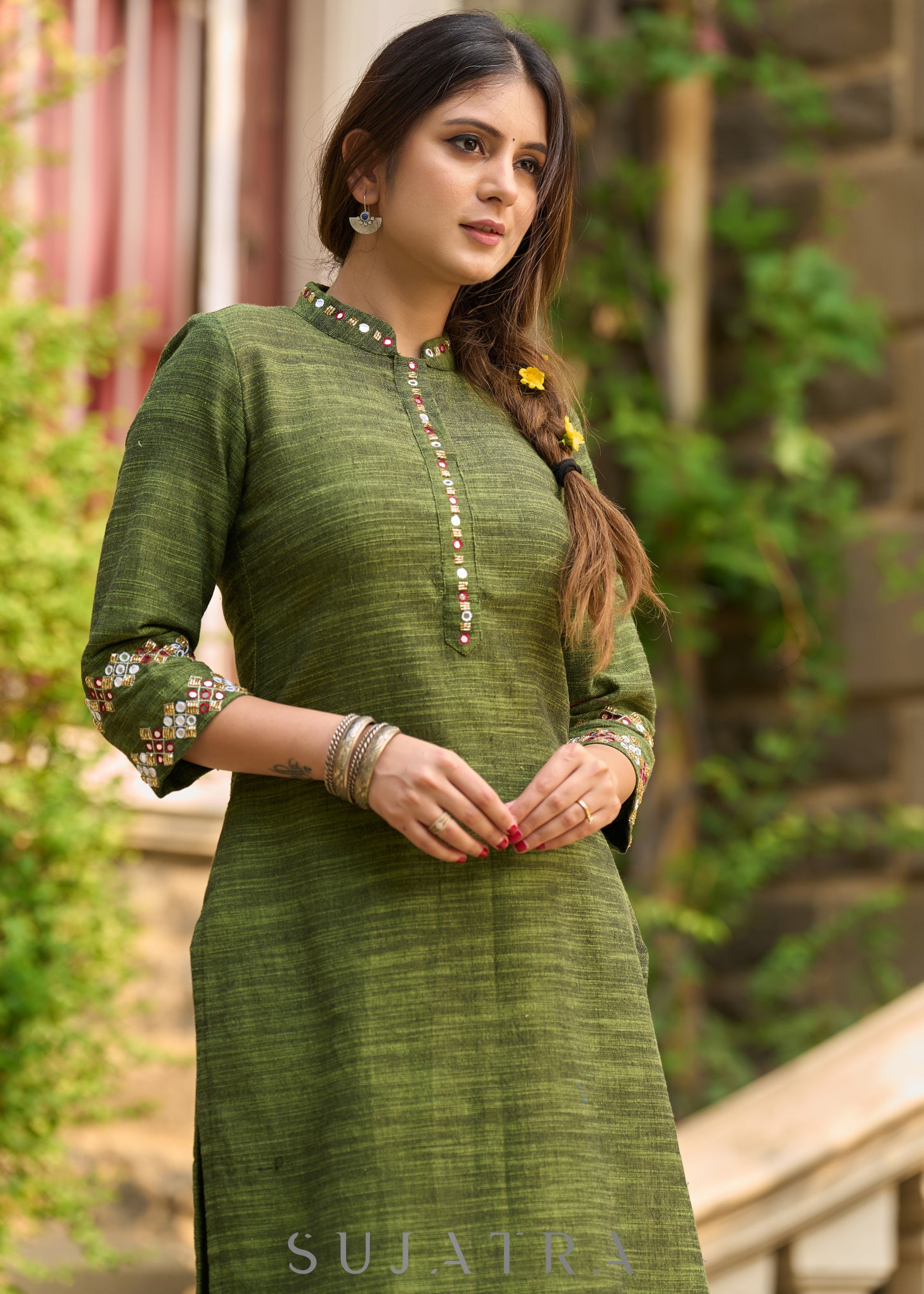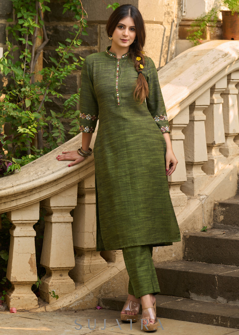 Sophisticated hand-embroidered olive green cotton kurta - Pants Optional