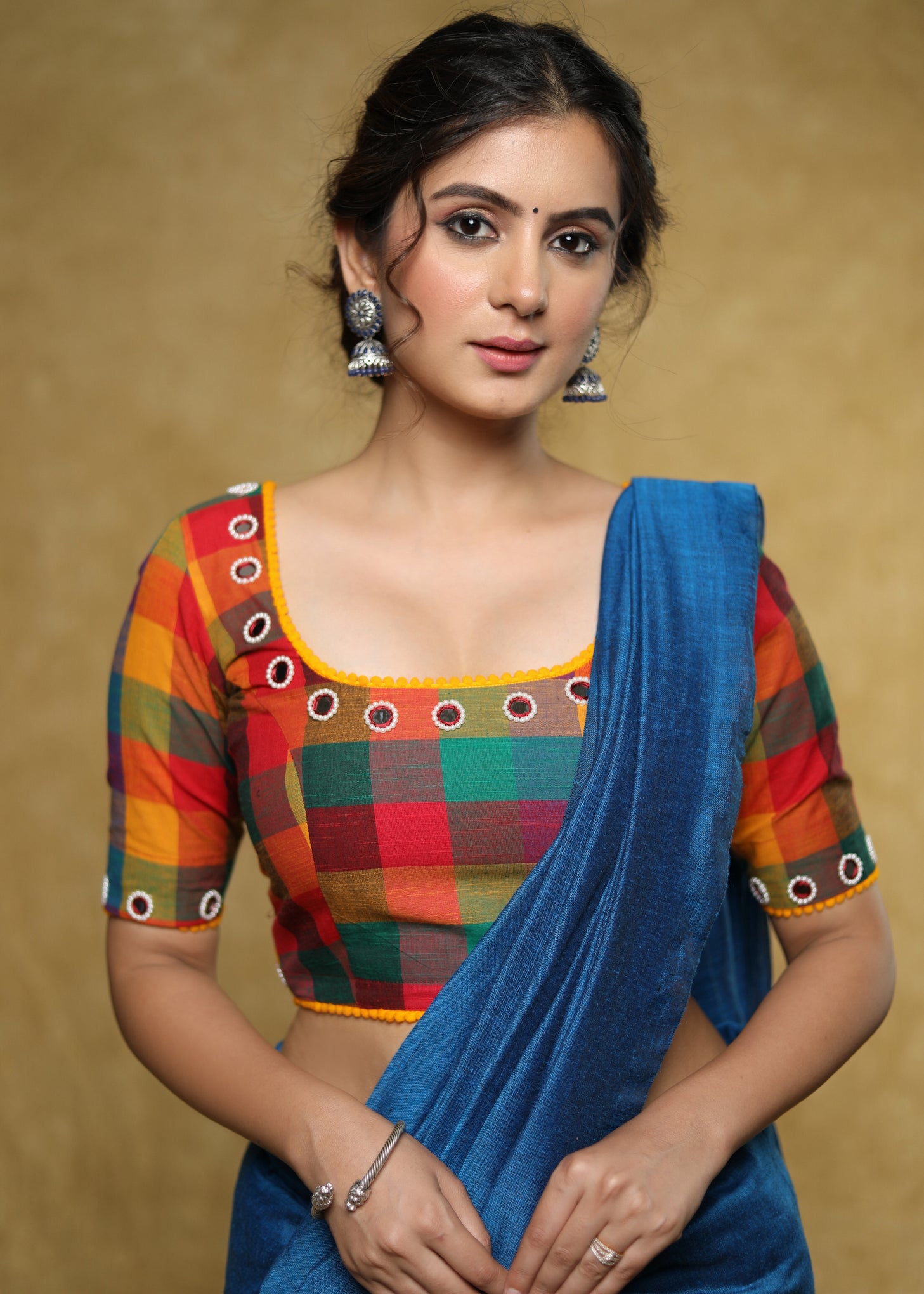 Standout checks Handloom Cotton blouse with delicate mirror work and lace detailing