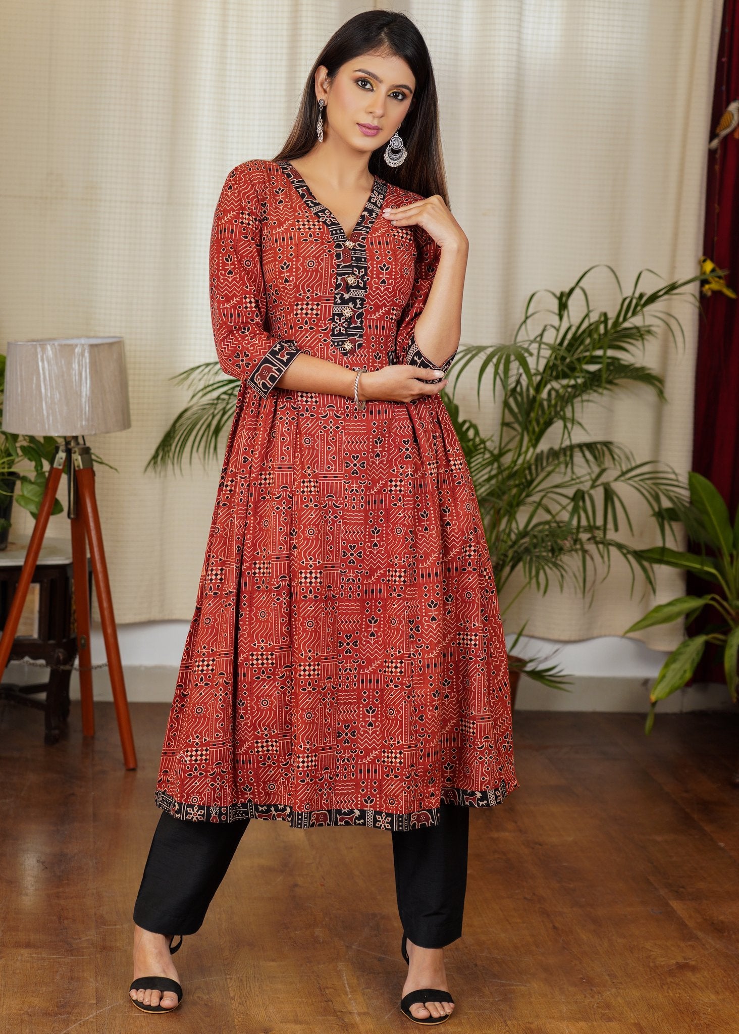 Stylish Ajrakh Combination Kurta With Beautiful Buttons