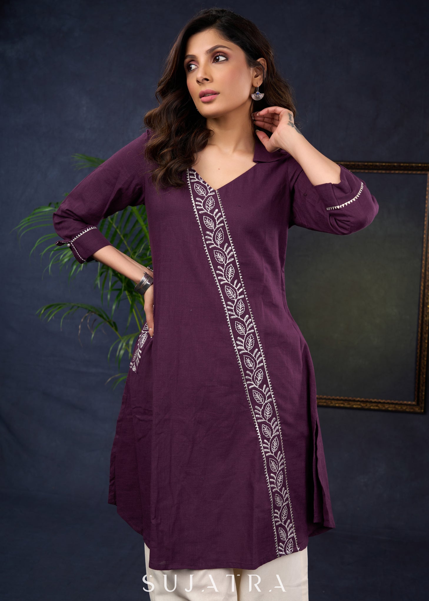 Stylish Asymmetrical Purple Cotton Tunic With Intricate Embroidery -Pant Optional