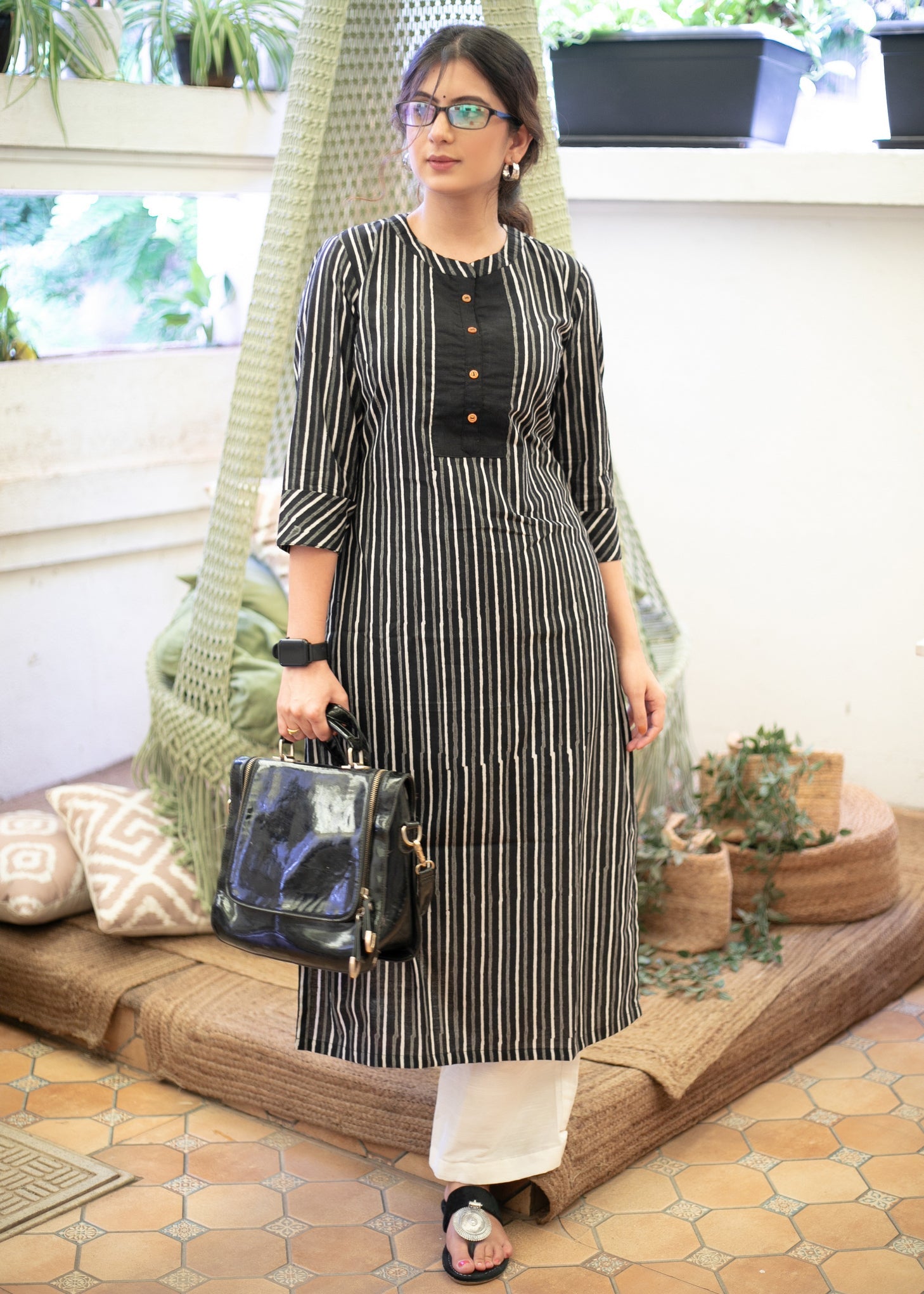 Trendy Cotton Black and White Striped Kurta - Pant Optional
