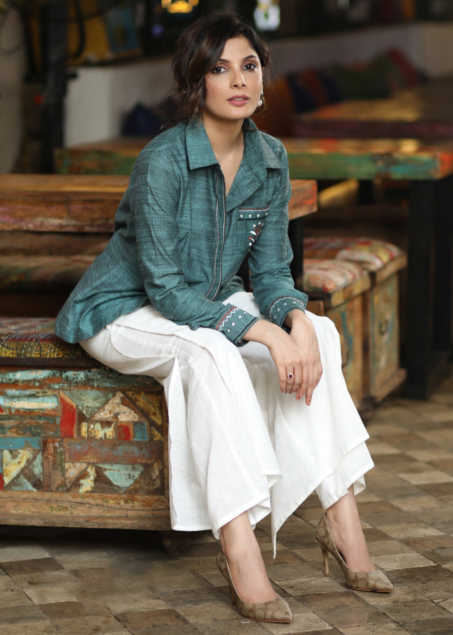 Trendy Cotton Textured Turquoise Casual Shirt with Elegant Embroidery on Pocket & Sleeves