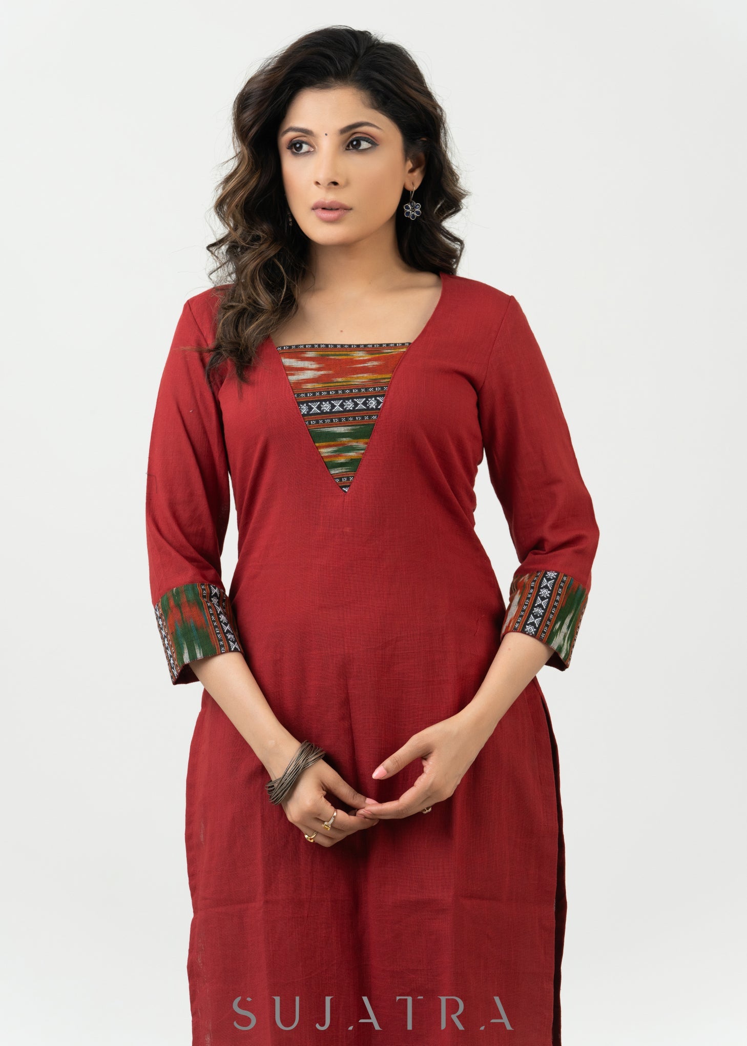 Trendy Maroon Cotton Ikat Combination Kurta - Ikat Pant Optional